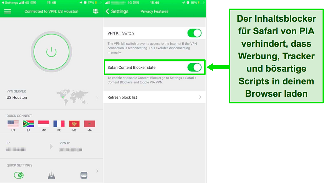 Private Internet Access (PIA) ist eines der wenigen VPN mit einer iOS-App mit vollem Funktionsumfang – es ist der einzige Anbieter auf meiner Liste mit einem Notausschalter in seinen Apps in nativem Deutsch für iPhone und iPad, und hat sogar einen integrierten Ad- und Malware-Blocker für iOS, namens Safari Content Blocker.